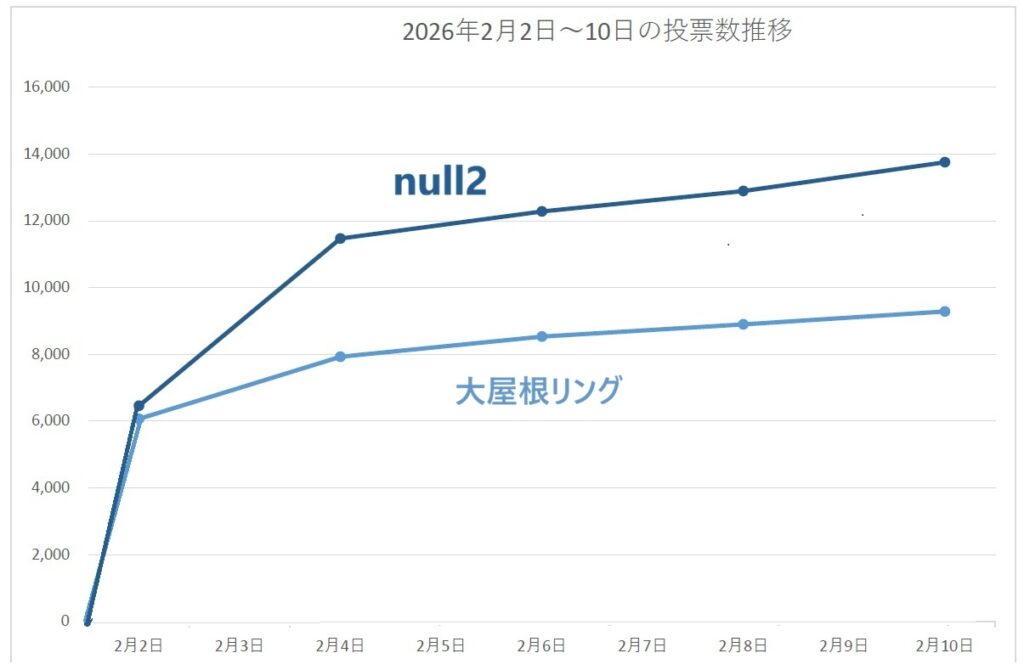 落合氏のこの投稿からじわじわと差がつき始め、2日目はnull²6457票、大屋根リング6066票とnull²やや有利で終えた。その投稿はむしろ3日目、4日目に影響を与え、4日目時点でnull²1万1469票、大屋根リング7922票と、1.4倍の差となった。この票差をほぼ維持したまま10日間を終えた形となる(最終日:null²1万3750票、大屋根リング7922票)。