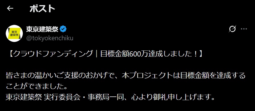 賞の残務がひと段落し、さてそろそろクラファンの呼び掛けに協力しなければと思っていた矢先の2月24日、東京建築祭の公式Xからこんなポストが流れてきた。